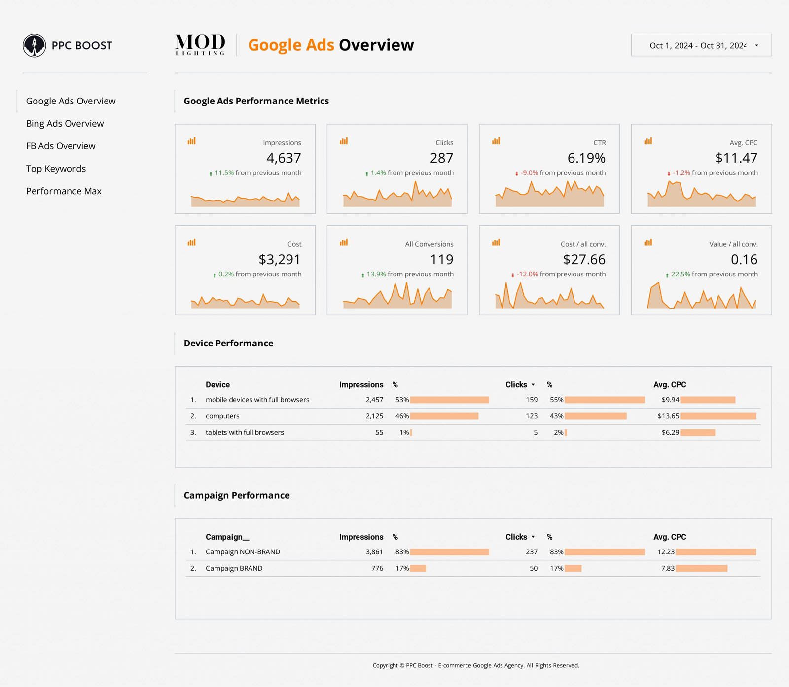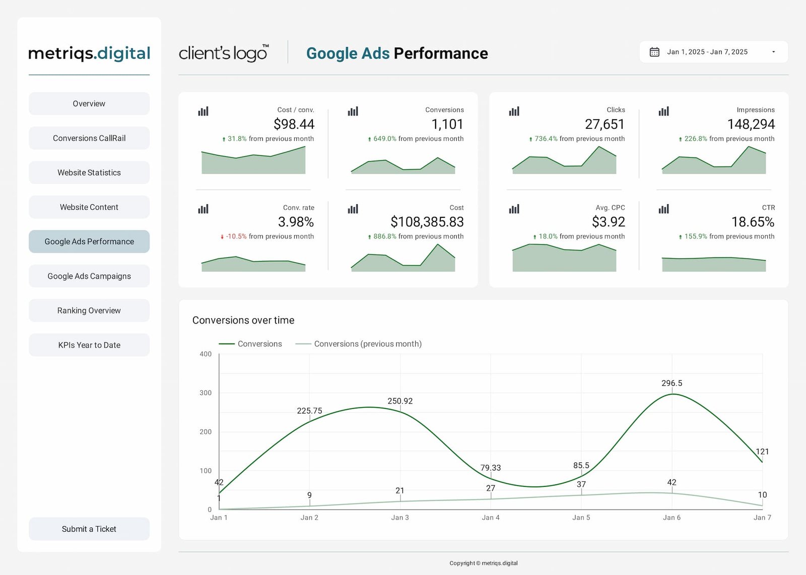 Get branded dashboards that integrate all your data sources, look professional, and duplicate to unlimited clients.
